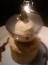 Encased in an edible dish or rather a shell made of sugar. Topped by a single blueberry sat a dolop of vanilla ice cream sprinkled delicately with a tiny sprig of mint and gold leaf. Looking very much like an undersized punch bowl the dish was entirely surrounded by blueberry sauce.