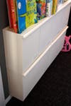 Check out these wall-mounted bins from Ikea that are meant to hold your recycling trash until it is time for a trip to the big bin headed for the curb. They are a nice, not-too-white, matte plastic. They tip out from the wall and operate really smoothly. And get this, they are easily removable. Just tip out, grab the handles and lift! There are three sizes to choose from: a small 2-gallon size, a medium 6-gallon size, and a large 12-gallon size, and they only poke out from the wall 7.75 inches.