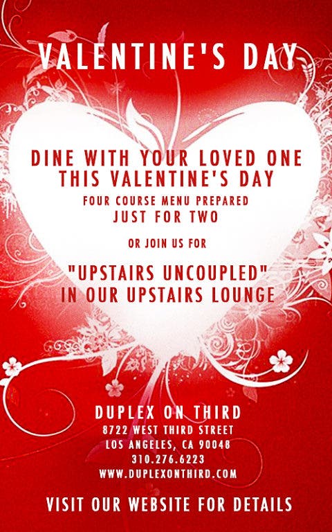 Just because you’re single this Valentine’s Day, all the more reason to mingle! Join Duplex in their upstairs lounge for “Upstairs Uncoupled,” offering special un-Valentine’s Day cocktails, DJ and a small-bites menu.