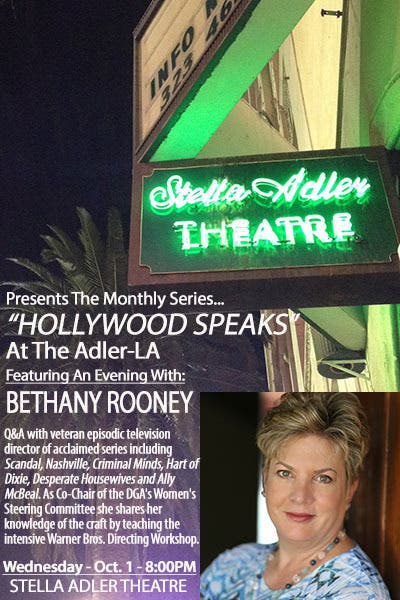 The Stella Adler Academy & Theatre is proud to present a new Series of One Night Only Guest Speakers in “HOLLYWOOD SPEAKS AT THE ADLER” – On October 1st at 8pm, BETHANY ROONEY, will talk about her experience as a freelance episodic television director and answer questions from the audience.