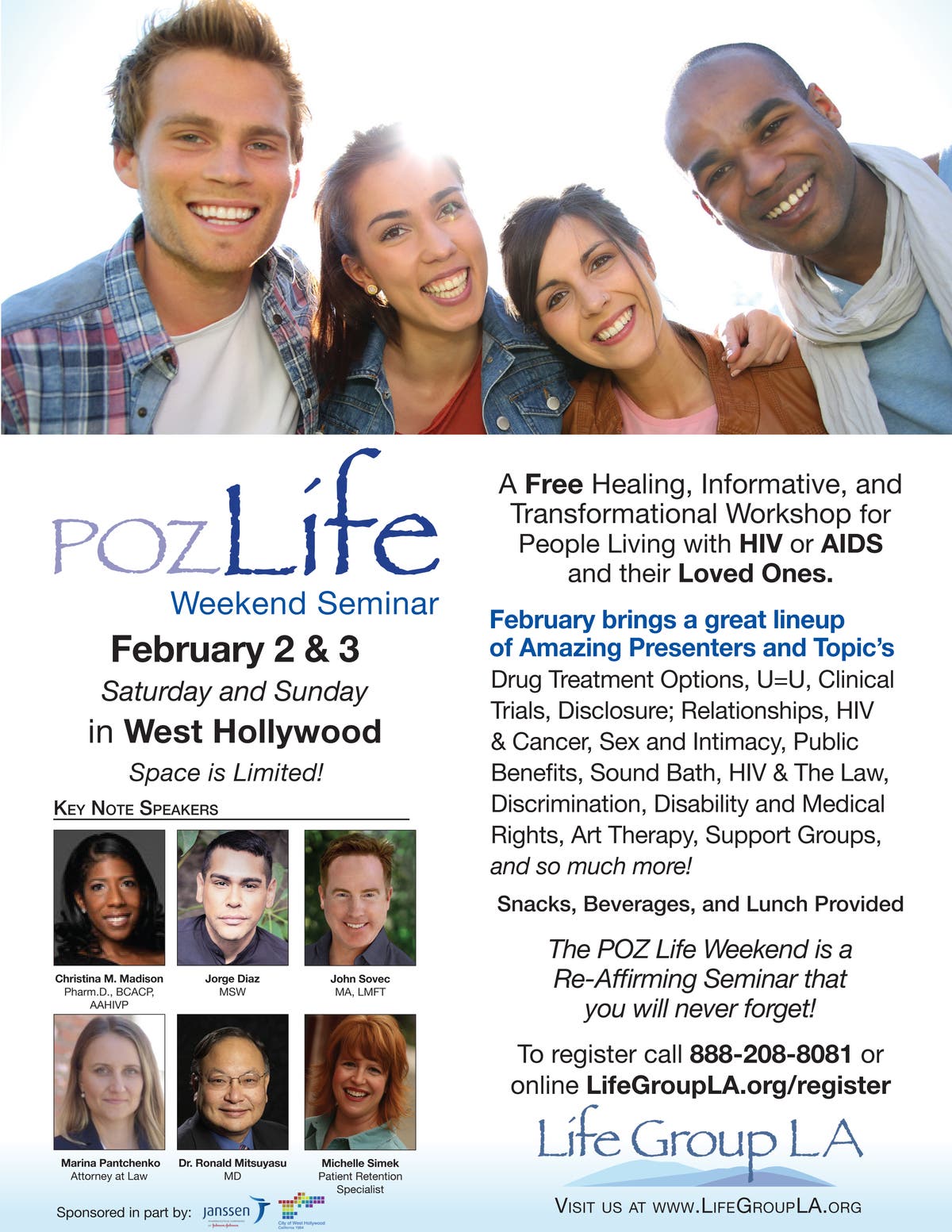 Life Group LA’s presents their POZ Life Weekend Seminar in West Hollywood, CA on the weekend of February 2 & 3, 2019. Limited space, register today at http://thelifegroupla.org/rez1... or call 888-208-8081. The weekend is sponsored in part by Janssen and The City of West Hollywood.