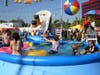 A water park area near the main entrance to the LA Pride Festival features inflatable pools, water slide, bouncy house, DJ and bartenders.