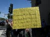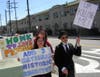 About 30 people showed up on the corner of Santa Monica Boulevard and Formosa Avenue in West Hollywood on Sunday afternoon. Some dressed as classic movie characters, others carried signs and cheered as cars drove by honking in support.