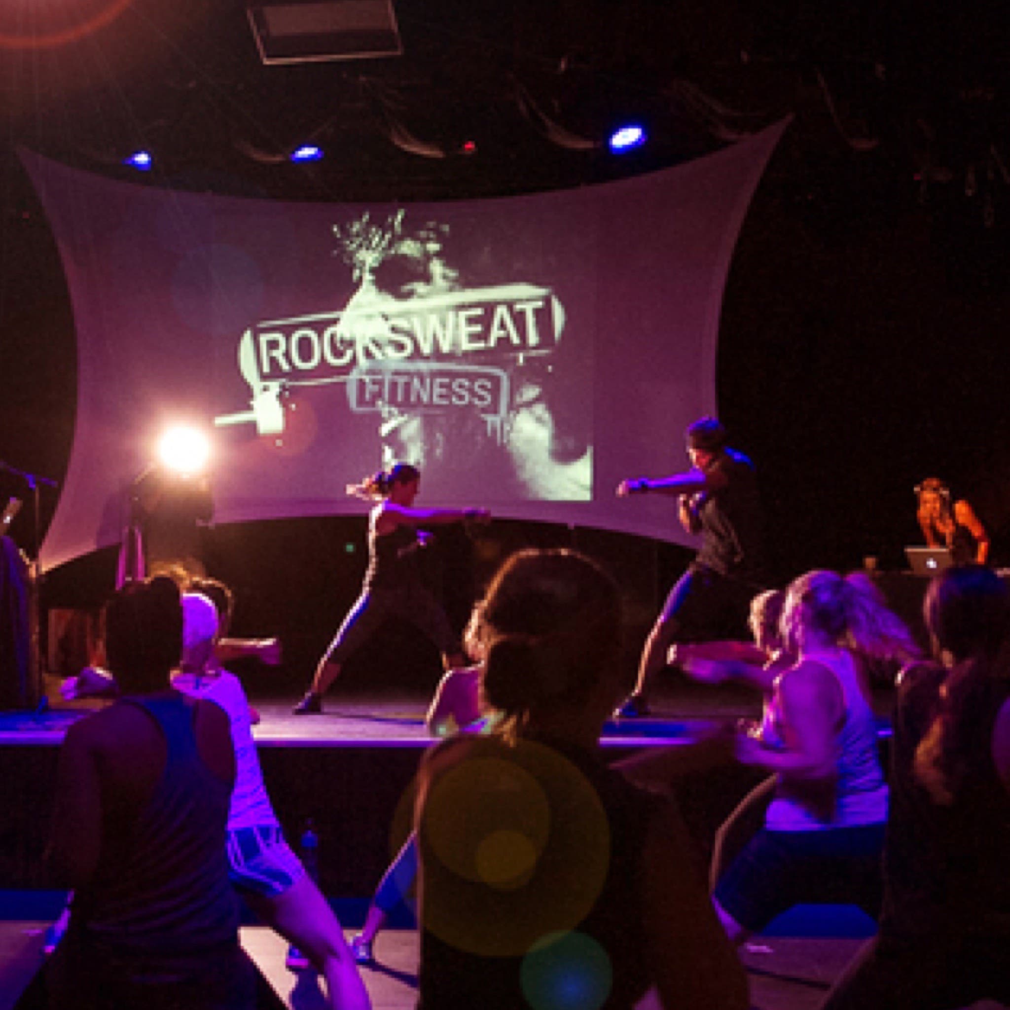RockSweat is a new fitness concept developed by a music industry executive and a certified group trainer that merges the adrenaline rush of a killer workout with the one you get at a concert and takes place inside the historic Roxy Theatre on the Sunset Strip. RockSweat has the awesome effects of a highly produced live show complete with lights, a big sound system, a DJ, an emcee, and that blood-pumping feeling you get when you walk into a night club and feel the music in your chest.