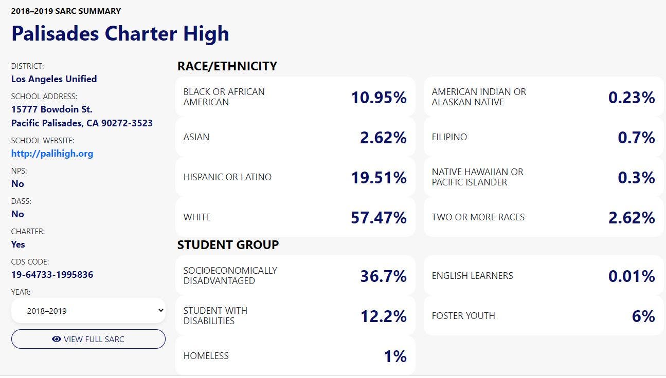 The climate is not the only difference between these two areas of Melvoin’s school board district. While 36.7% of the students at Pali are “Socioeconomically Disadvantaged,” Taft High School in Woodland Hills serves a student body where 59.5% of the students fall into this category. At the independent charter, 19.51% of the students are Hispanic or Latino. Taft’s student body is 38.7% Hispanic or Latino. Only 0.01% of the students at Pali are considered to be English Learners while Taft absorbs the cost of serving the 4.9% of their population who need the services to learn English. The prioritization for construction projects for Pali is just another example of privately run charter schools draining money from BIPOC communities in need while increasing segregation in our publicly funded schools.