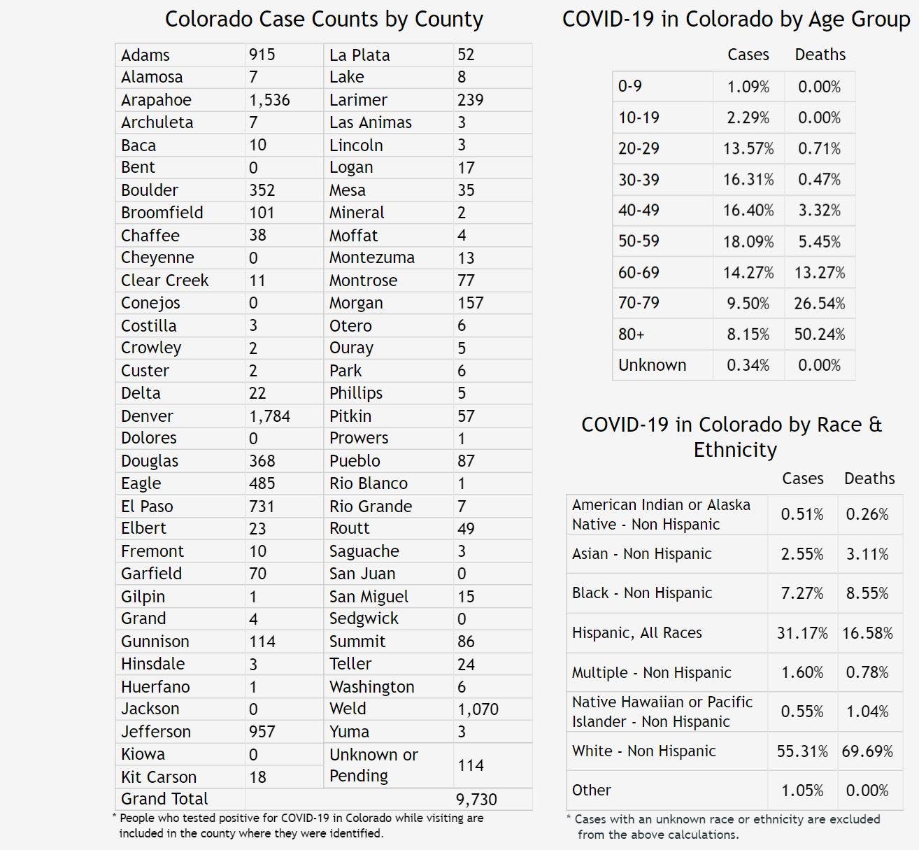 According to government data posted Sunday afternoon, 9,730 people were infected with the new coronavirus in Colorado among 46,195 people who have been tested since the outbreak began. There were 1,813 people hospitalized, and 422 deaths were confirmed.