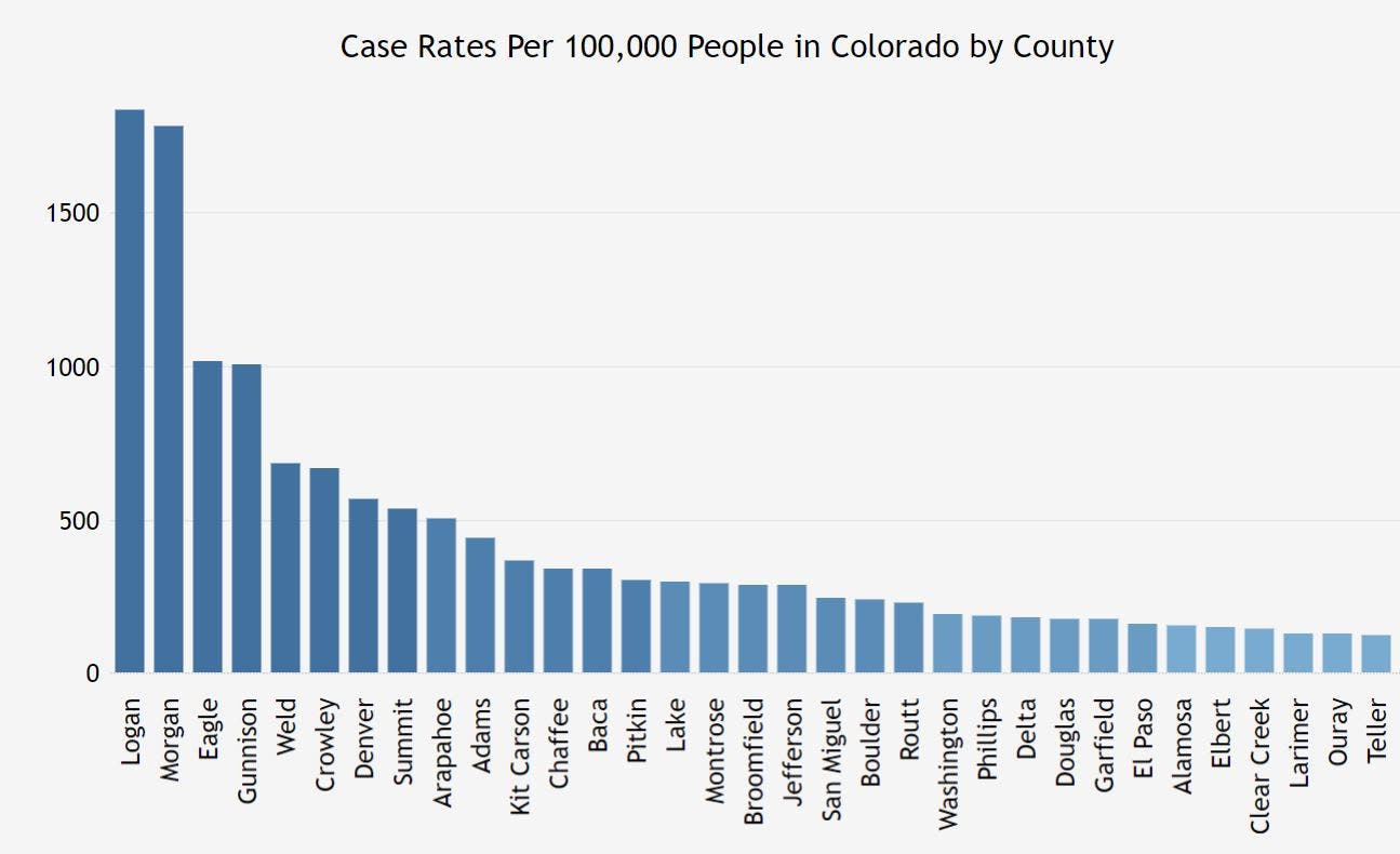 Denver, Arapahoe and Weld counties consistently have the highest overall number of cases in the state; however, Morgan, Logan and Eagle counties consistently have the highest case rates per 100,000 people.