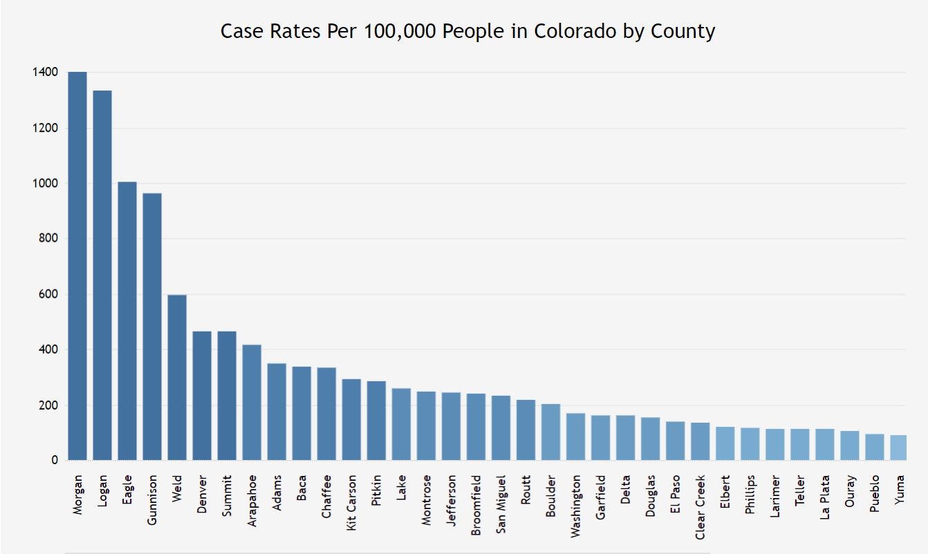 Denver, Arapahoe and Weld counties consistently have the highest overall number of cases in the state; however, Morgan, Logan and Eagle counties consistently have the highest case rates per 100,000 people.