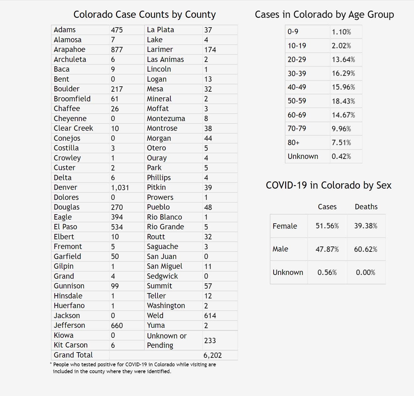 According to government data posted Thursday afternoon, there were 6,202 cases of the new coronavirus in Colorado among 31,180 people who have been tested. There were 1,221 people hospitalized, and 226 deaths were confirmed.