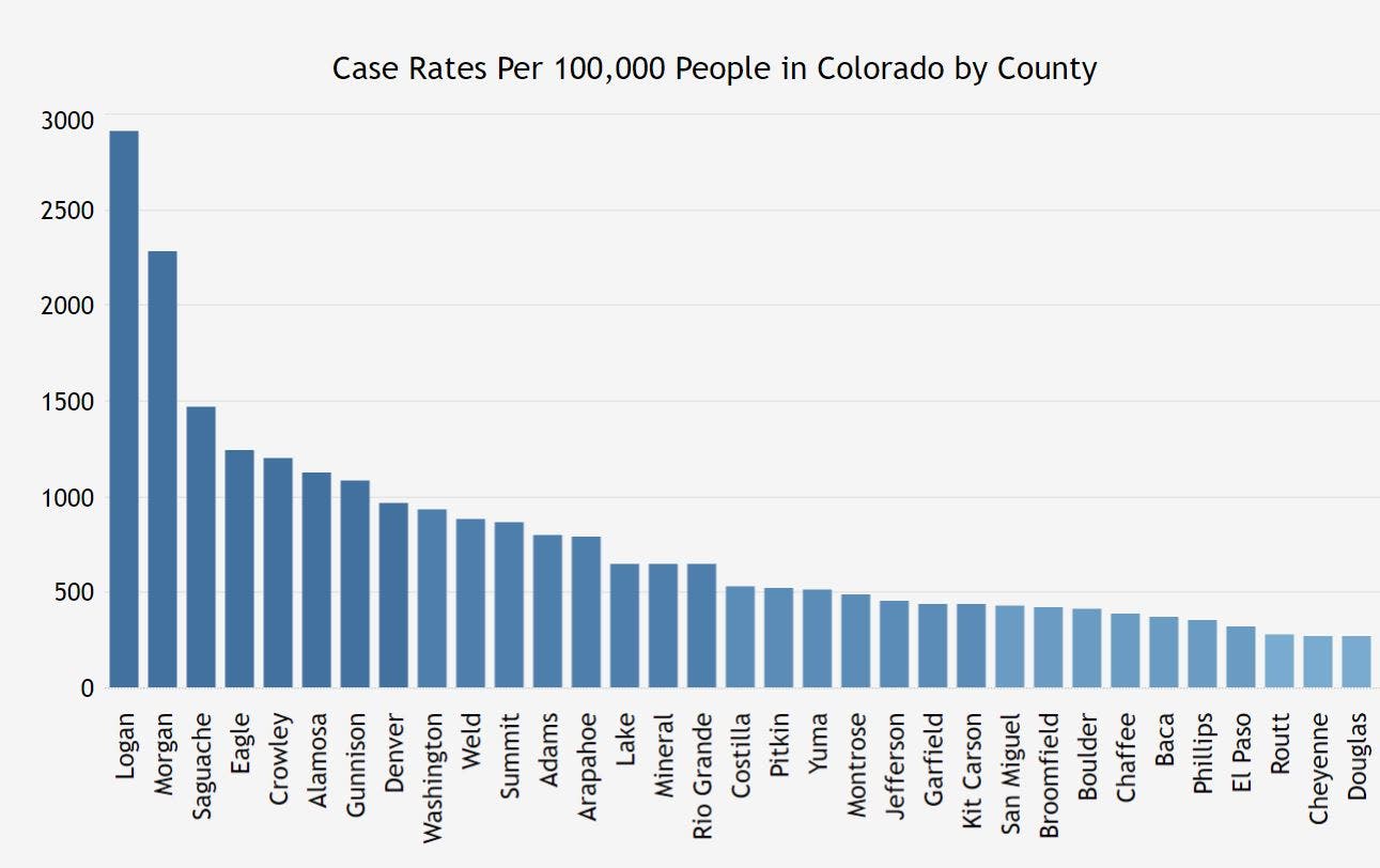Denver, Arapahoe and Weld counties consistently have the highest overall number of cases in the state; however over the past week, Logan, Morgan and Saguache counties have had the highest case rates per 100,000 people.