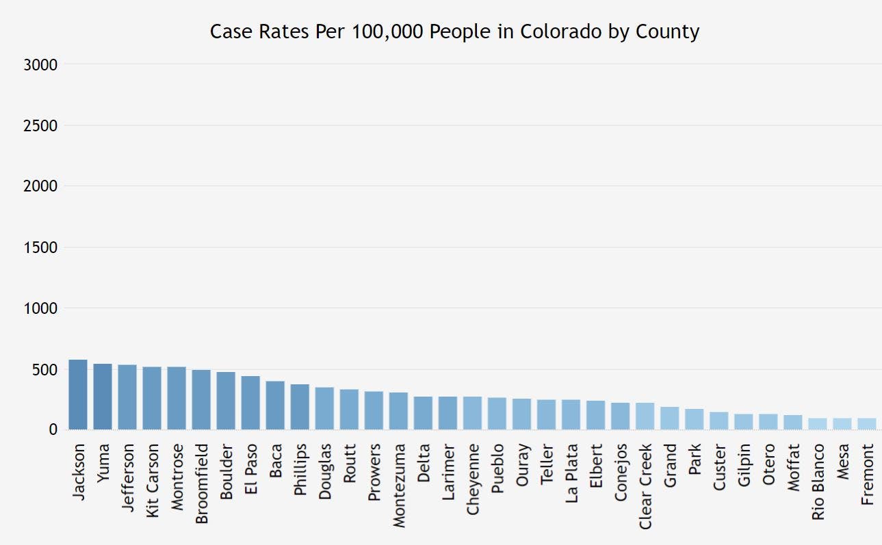 Denver, Arapahoe and Weld counties consistently have the highest overall number of cases in the state; however Logan, Morgan and Saguache counties have had the highest case rates per 100,000 people.