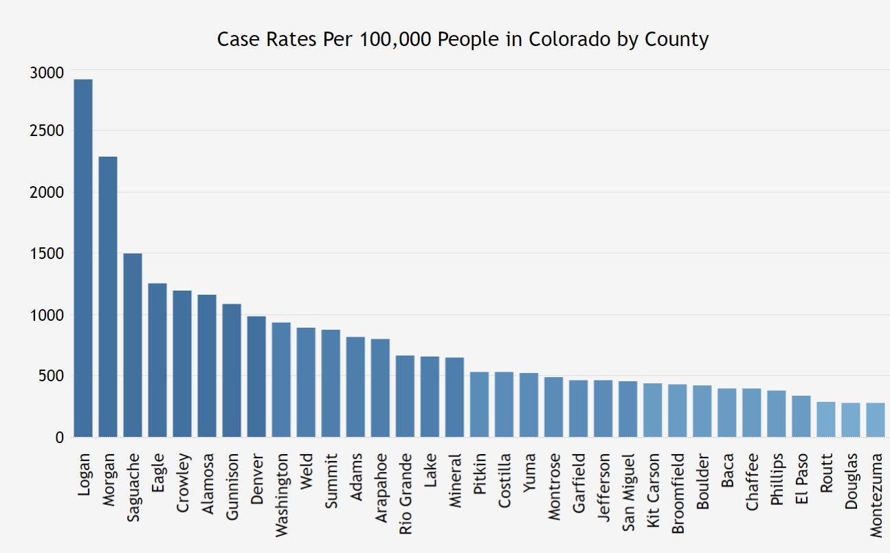 Denver, Arapahoe and Weld counties consistently have the highest overall number of cases in the state; however over the past week, Logan, Morgan and Saguache counties have had the highest case rates per 100,000 people.