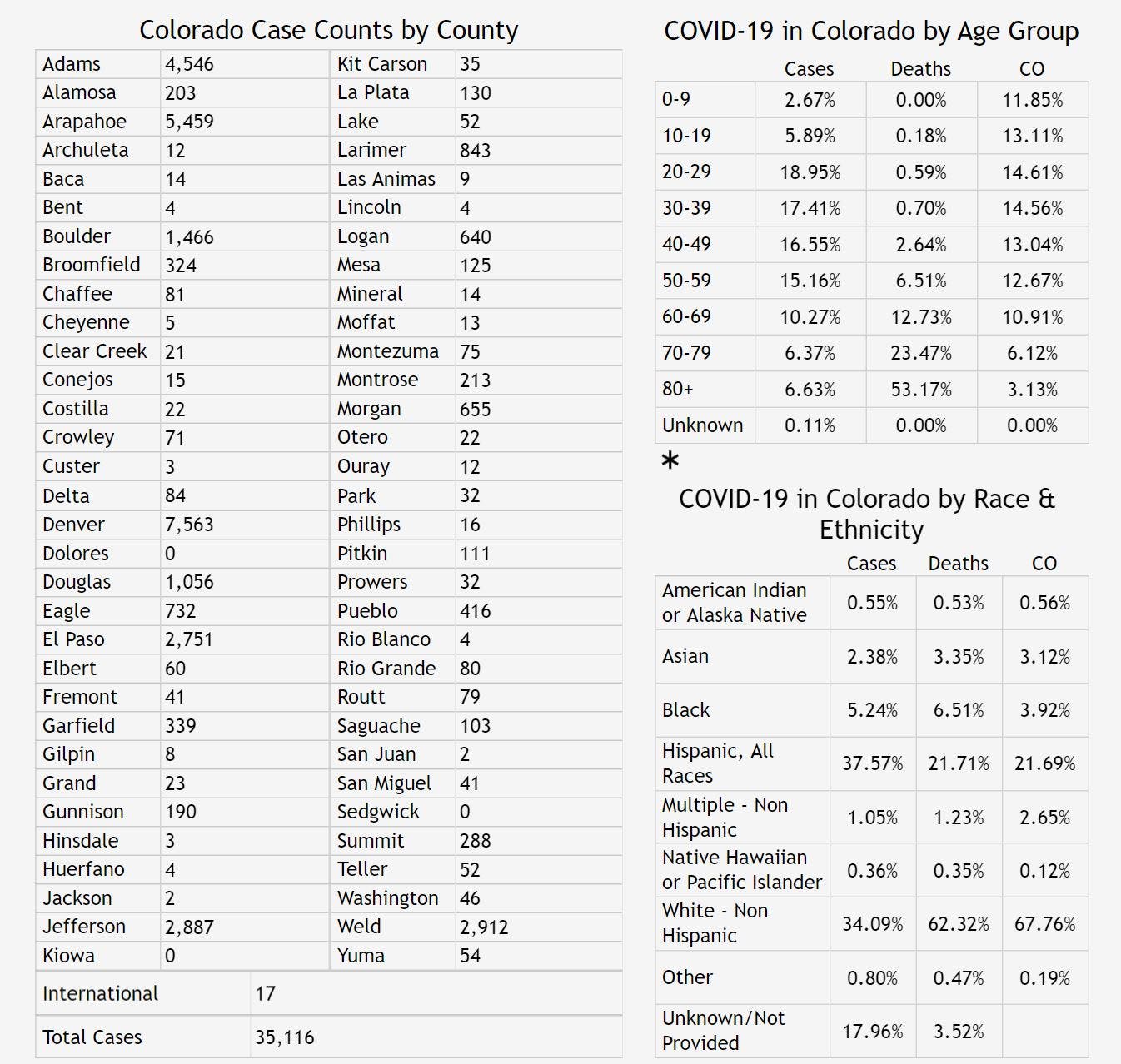 As of Wednesday, 35,116 people had been infected with the coronavirus in Colorado among 367,724 people who have been tested since the outbreak began, health officials confirmed. Around 5,820 people have been hospitalized, and the death toll among people who tested positive for COVID-19 has reached 1,704.