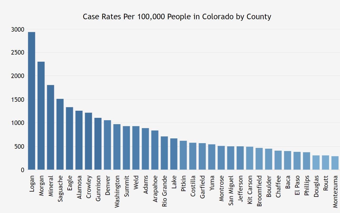 Denver, Arapahoe and Weld counties consistently have the highest overall number of cases in the state; however Logan, Morgan and Saguache counties have had the highest case rates per 100,000 people.