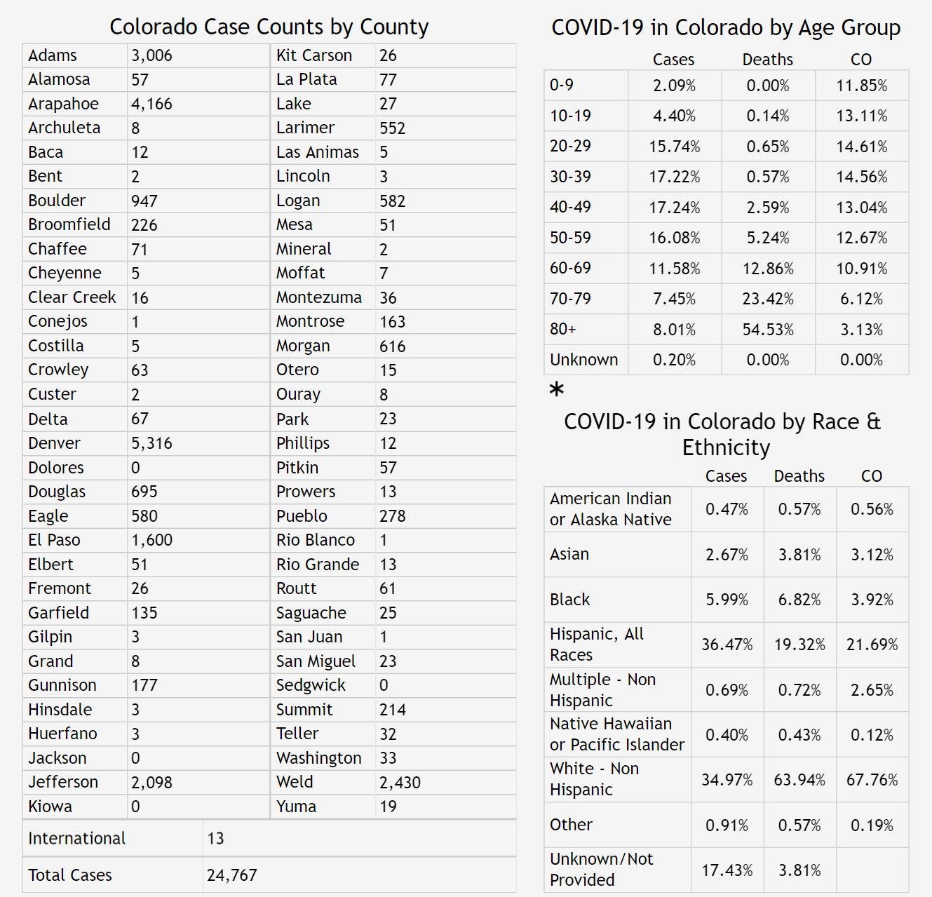 As of Wednesday afternoon, 24,767 people have been infected with the new coronavirus in Colorado among 160,796 people who have been tested since the outbreak began, health officials confirmed. Around 4,196 people have been hospitalized, and the death toll among people who tested positive for COVID-19 has reached 1,392.