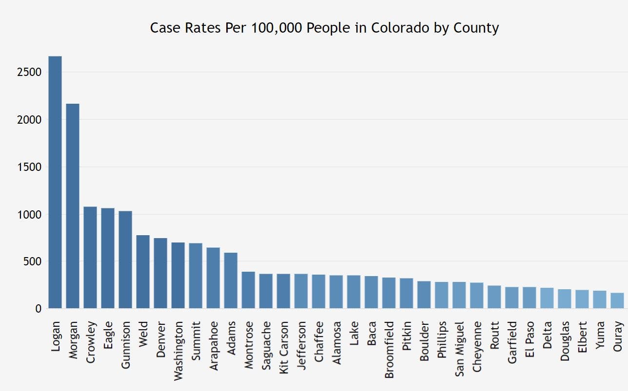 Denver, Arapahoe and Weld counties consistently have the highest overall number of cases in the state; however, Morgan, Logan, Gunnison and Eagle counties consistently have the highest case rates per 100,000 people.