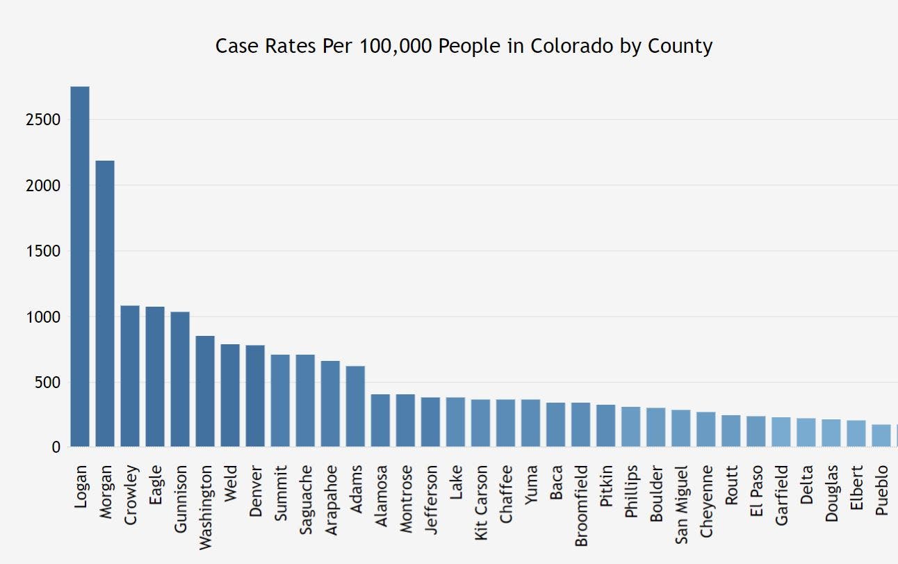 Denver, Arapahoe and Weld counties consistently have the highest overall number of cases in the state; however, Morgan, Logan and Gunnison counties consistently have the highest case rates per 100,000 people.