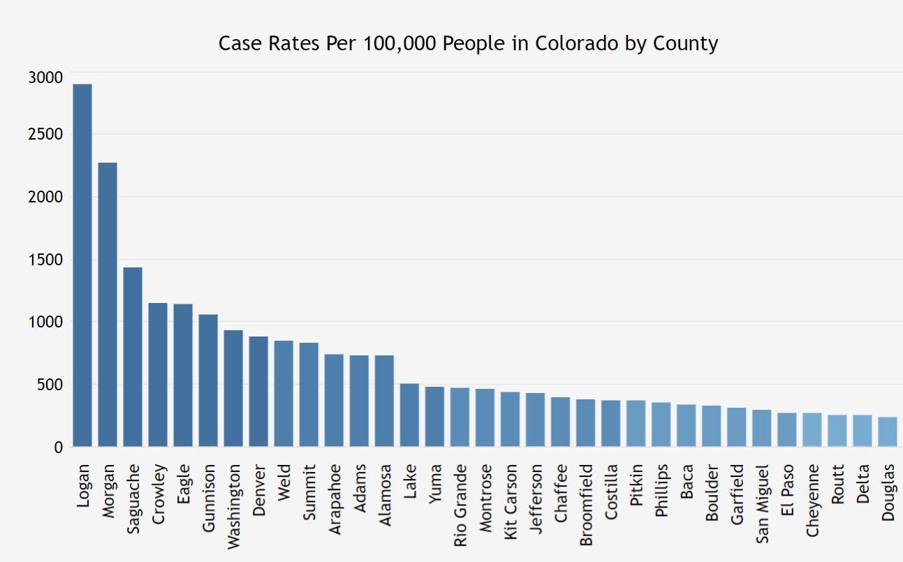 Denver, Arapahoe and Weld counties consistently have the highest overall number of cases in the state; however, Morgan, Logan and Saguache counties consistently have the highest case rates per 100,000 people.