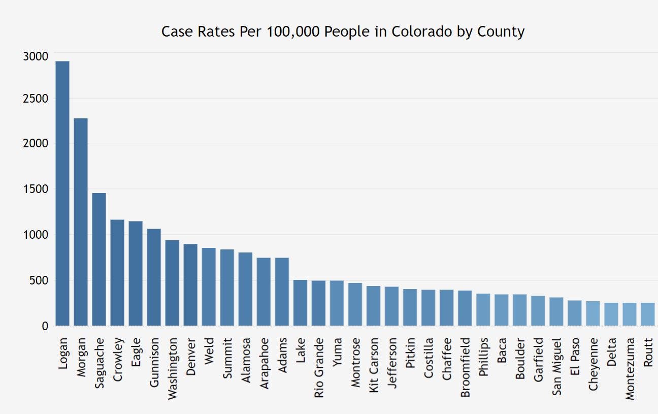 Denver, Arapahoe and Weld counties consistently have the highest overall number of cases in the state; however, Morgan, Logan and Saguache counties consistently have the highest case rates per 100,000 people.