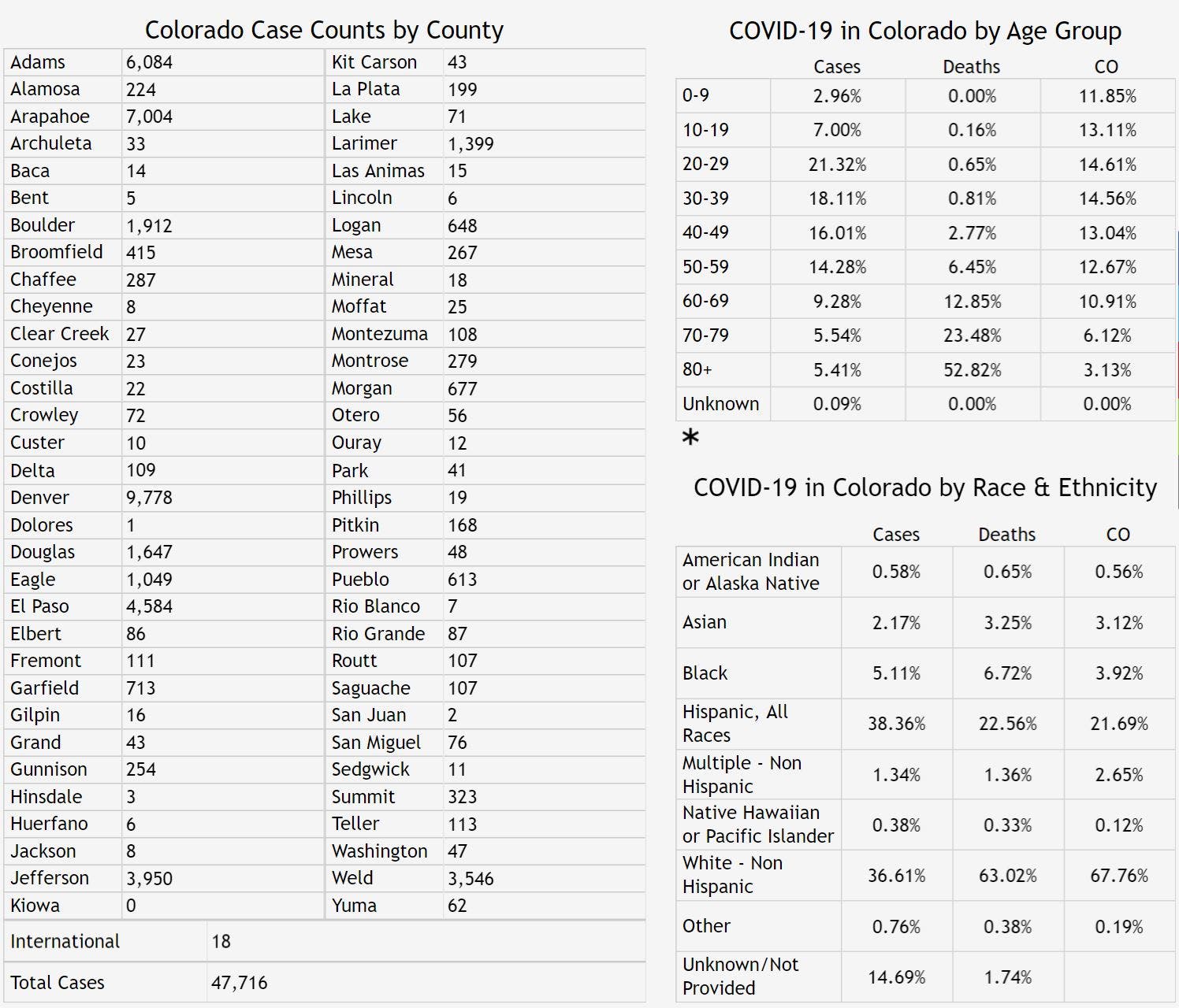 Over the past week, more than 3,300 new cases of the coronavirus have been reported in Colorado, according to public health data. As of Sunday, 47,716 people had been infected with the coronavirus in the state among 544,023 people who have been tested since the outbreak began, health officials confirmed. Around 6,474 people have been hospitalized, and the death toll has reached 1,691.