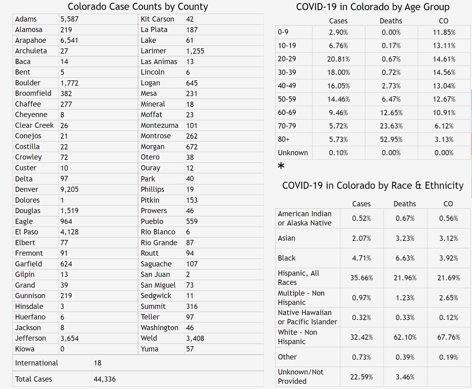 Over the past week, more than 3,500 new cases of the coronavirus have been reported in Colorado, according to public health data. As of Sunday, 44,336 people had been infected with the coronavirus in the state among 494,626 people who have been tested since the outbreak began, health officials confirmed. Around 6,268 people have been hospitalized, and the death toll has reached 1,661.