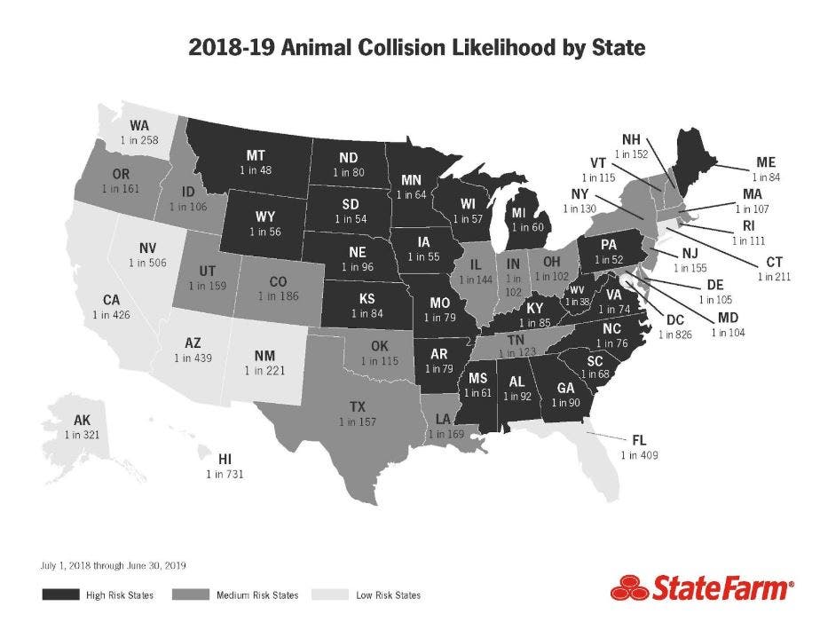 The likelihood of a vehicle-animal collision is based on the insurer’s estimate that U.S. motorists made more than 1.9 million animal collision claims from July 1, 2018, to June 30, 2019.