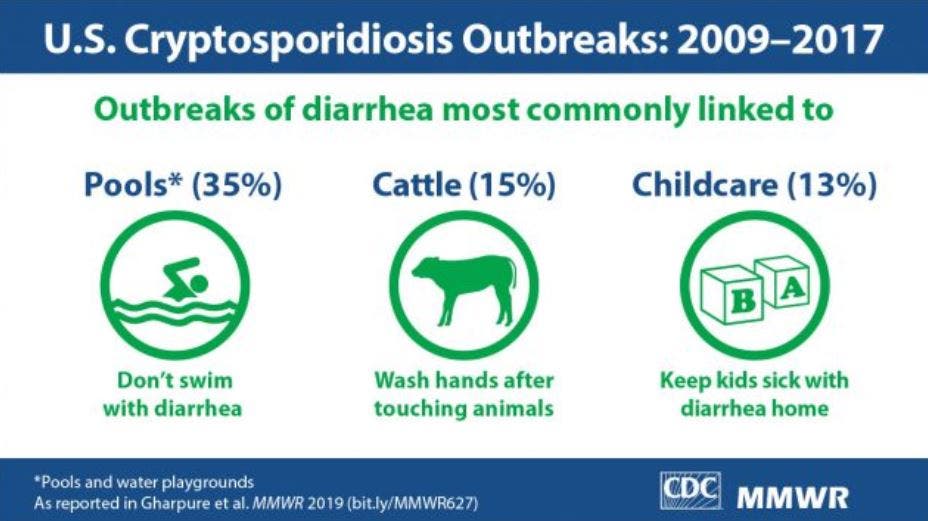 The CDC said 35 percent of outbreaks of cryptosporidiosis were linked to treated swimming pools and water playgrounds from 2009 to 2017, the latest year for which data are available. Crypto outbreaks increased annually at an average rate of 13 percent, and nearly 7,500 people were sickened in 444 Crypto outbreaks. Although cryptosporidiosis is almost never fatal, one person died during the period and 287 others required hospitalization.