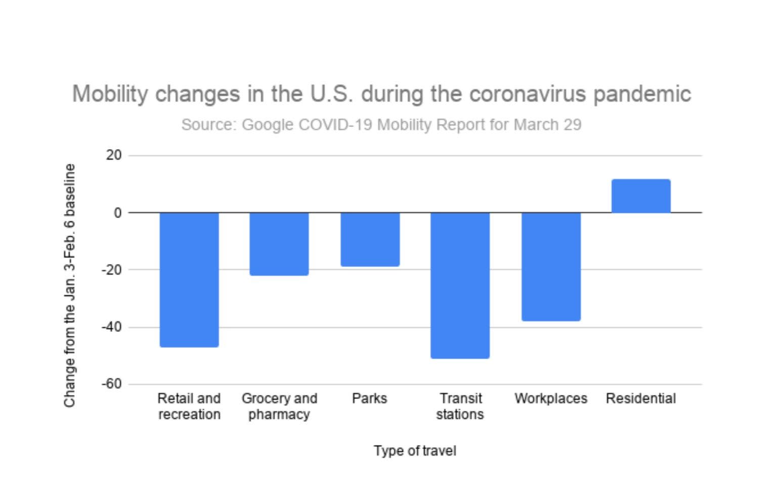 As of March 29, Google reports that nationwide movement to retail and recreational locations, including restaurants, shopping centers, movie theaters and the like, dropped 47 percent against a baseline set for the weeks Jan. 3 to Feb. 6.