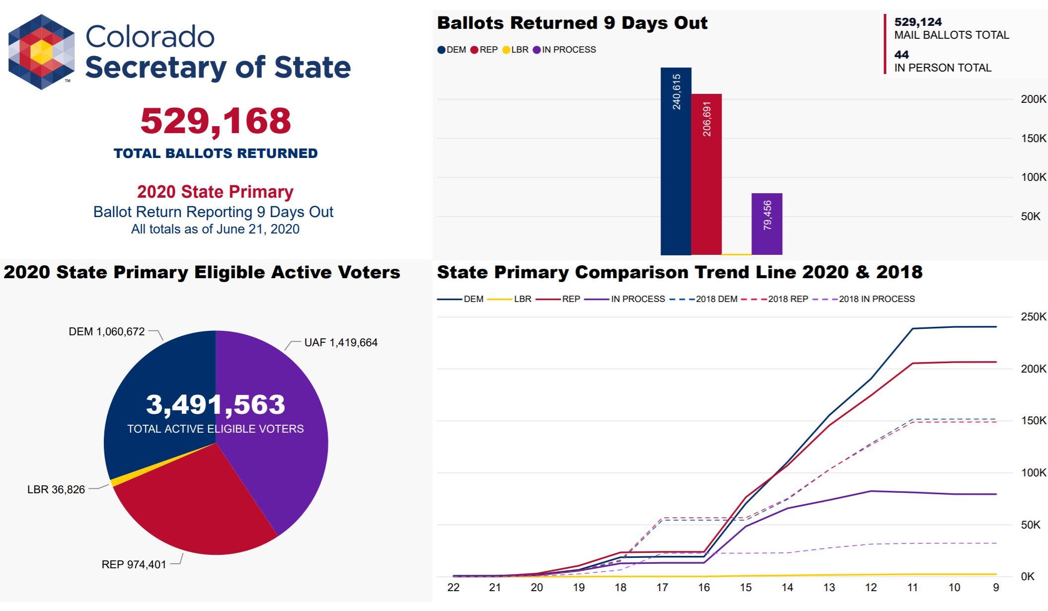 Thousands of Coloradans have already returned their ballots to county clerks for the state primary June 30. The Colorado Secretary of State's office is sending daily updates to let voters know how many ballots have been returned from each party. As of Monday, 529,168 ballots have been returned.