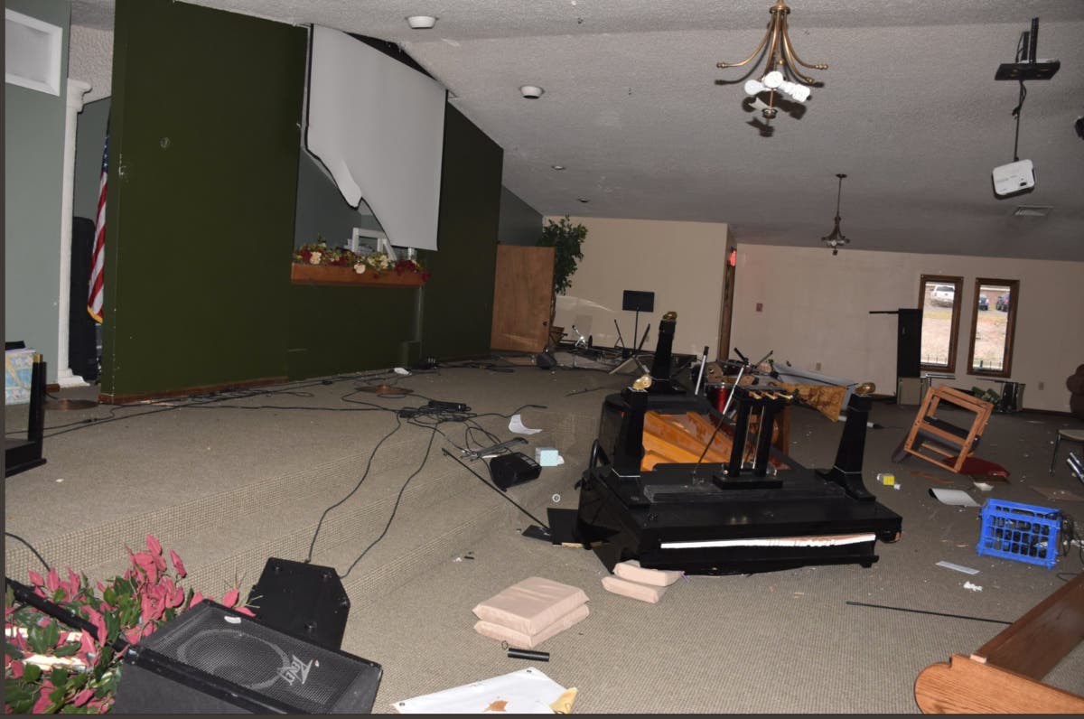 Chairs were tossed through windows. A projector screen had massive rips. The projector was smashed. The grand piano was upside-down and destroyed. Coffee pots lay inside a gashed drum set. Sound equipment was thrown around the room, their cords ruined. Fire extinguishers were blown into refrigerators.