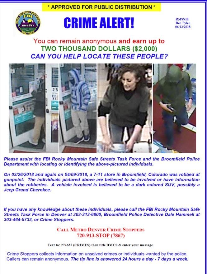 Last week Police issued a $2,000 Metro Crime Stoppers reward for people caught on surveillance video March 26 and again on April 9 at the 7-Eleven store on West 120th Avenue in Broomfield.