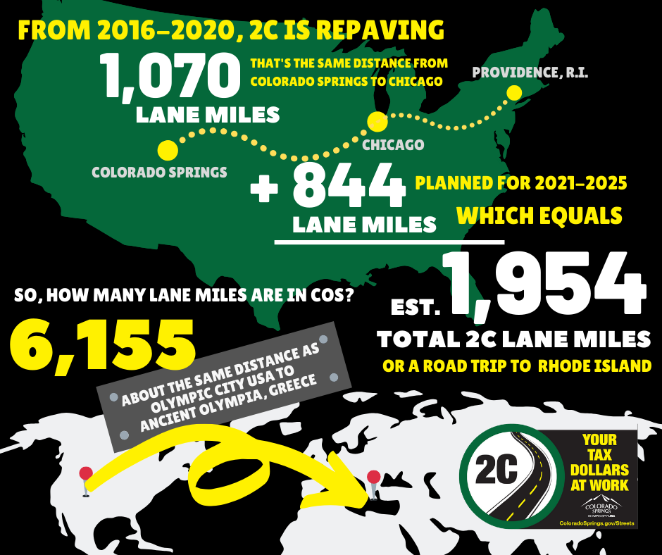 The first edition of 2C, a five-year 0.62 percent sales tax, was passed by voters in 2015 and is set to repave a total of 1,070 lane miles by the end of 2020. This November, voters again said yes to 2C, this time a five-year 0.57 percent sales tax, slated to pave approximately 884 lane miles.