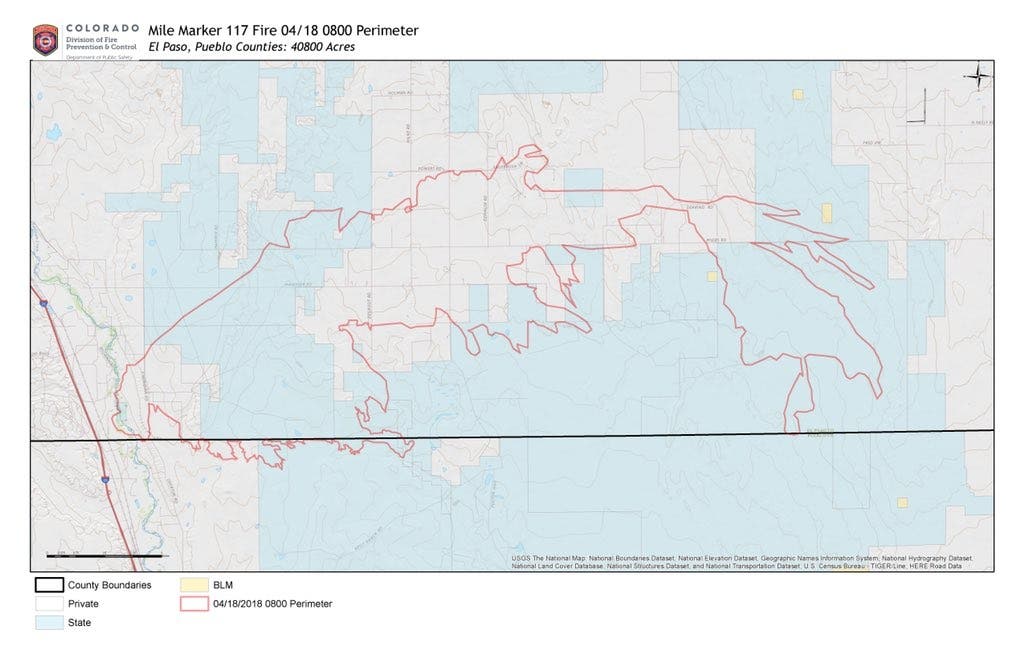 COLORADO SPRINGS, CO -- The El Paso and Pueblo County Sheriff's Offices said the wildfire that started near mile-marker 117 on I-25 south of Wigwam is still raging, especially in the northeast and southeast corners. El Paso County Sheriff Bill Elder announced as of Wednesday morning, 40,892 acres had burned. Two firefighters received medical treatment for smoke inhalation.