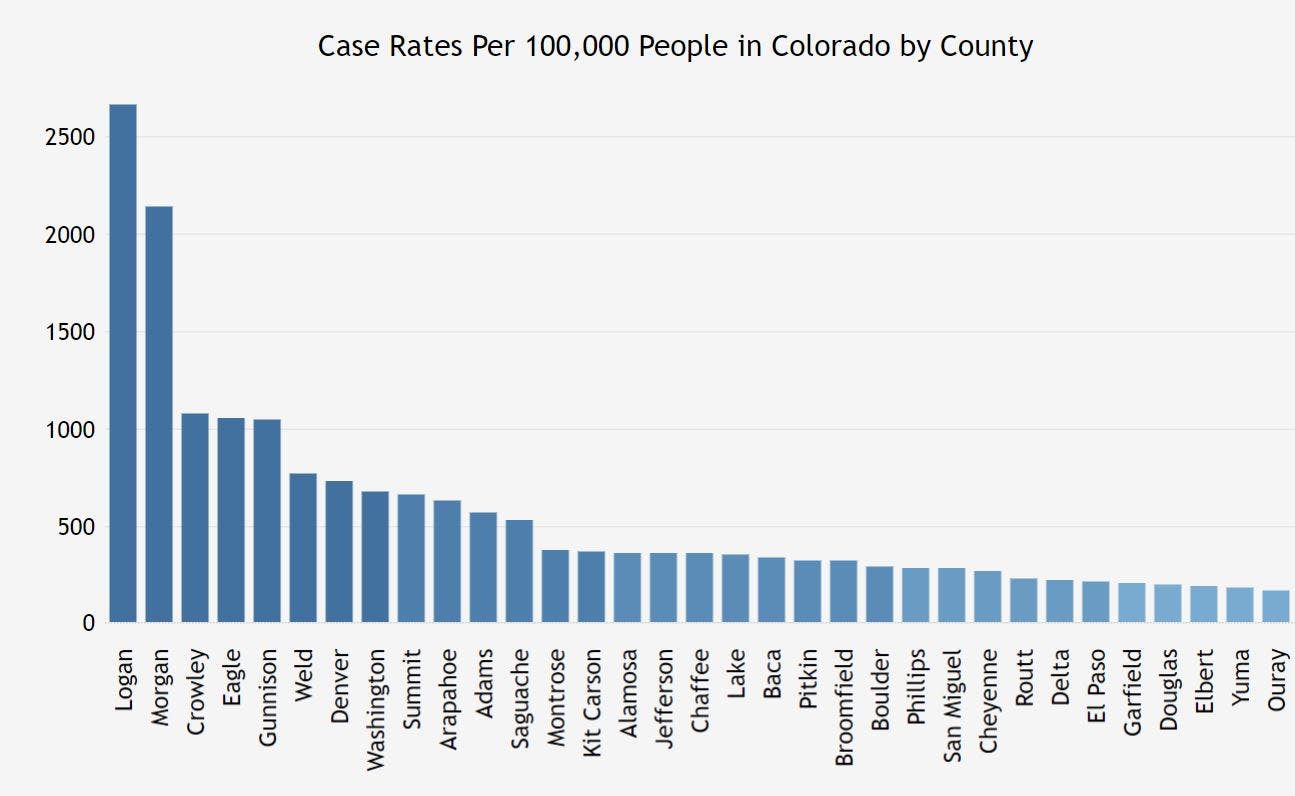 Denver, Arapahoe and Weld counties consistently have the highest overall number of cases in the state; however, Morgan, Logan, Gunnison and Eagle counties consistently have the highest case rates per 100,000 people.