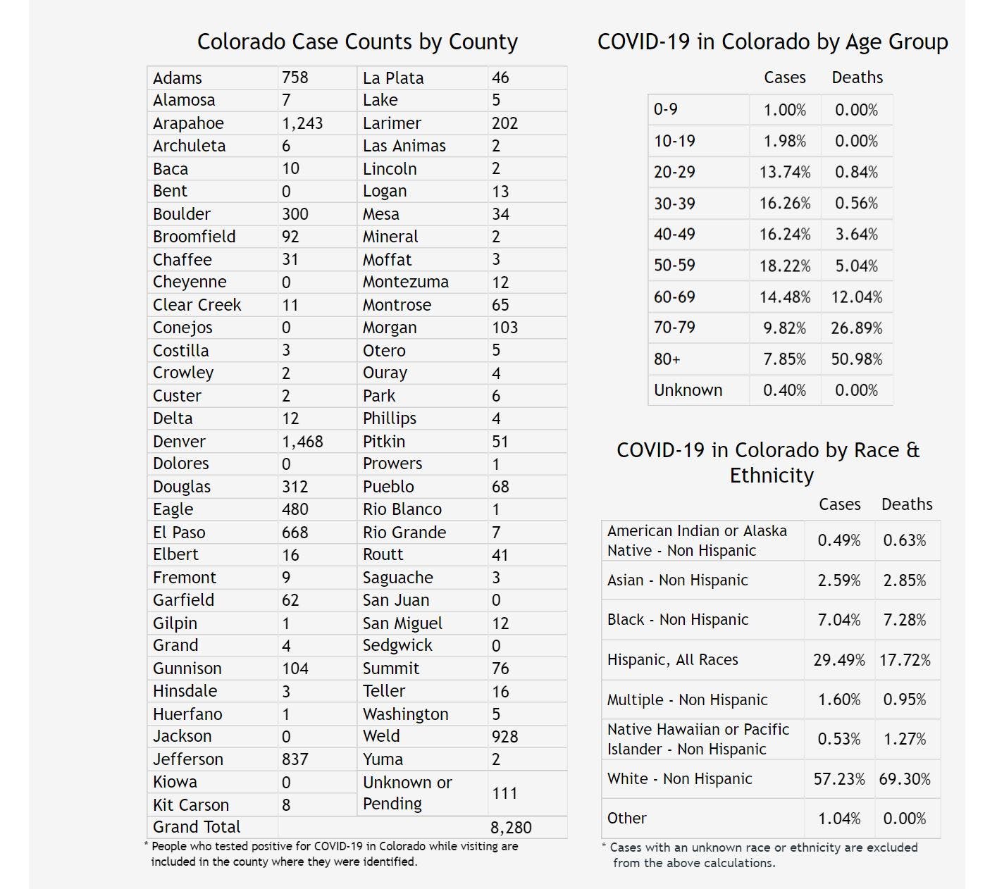 According to government data posted Wednesday afternoon, there were 8,280 cases of the new coronavirus in Colorado among 40,533 people who have been tested. There were 1,636 people hospitalized, and 357 deaths were confirmed.