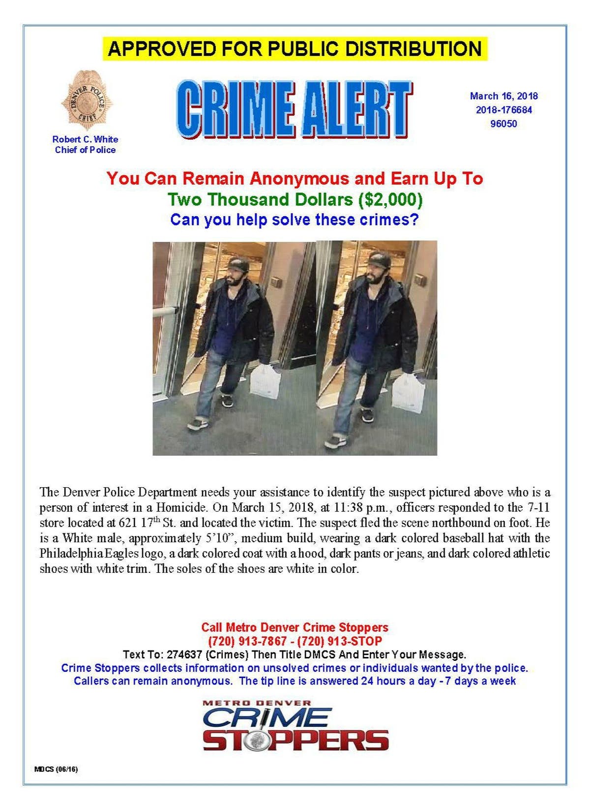 If you have any information about this person, please call Metro Denver Crime Stoppers at 720-913-7867 (913-STOP). You may be eligible for a $2,000 reward for information leading to the arrest and conviction of this suspect.