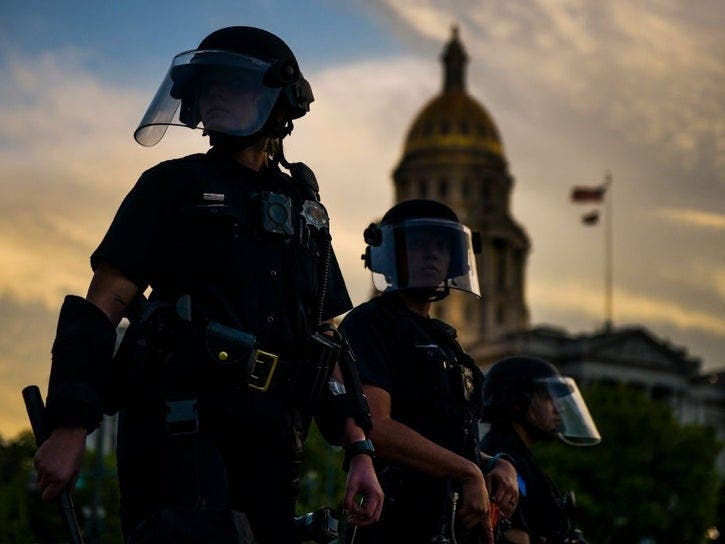 The Colorado National Guard and police officers were able to create a blockade and keep most protesters away from the Capitol Saturday night, but hundreds of people continued to march on Denver's downtown streets. Video footage and photos posted on social media show dumpster fires, fireworks and broken windows.