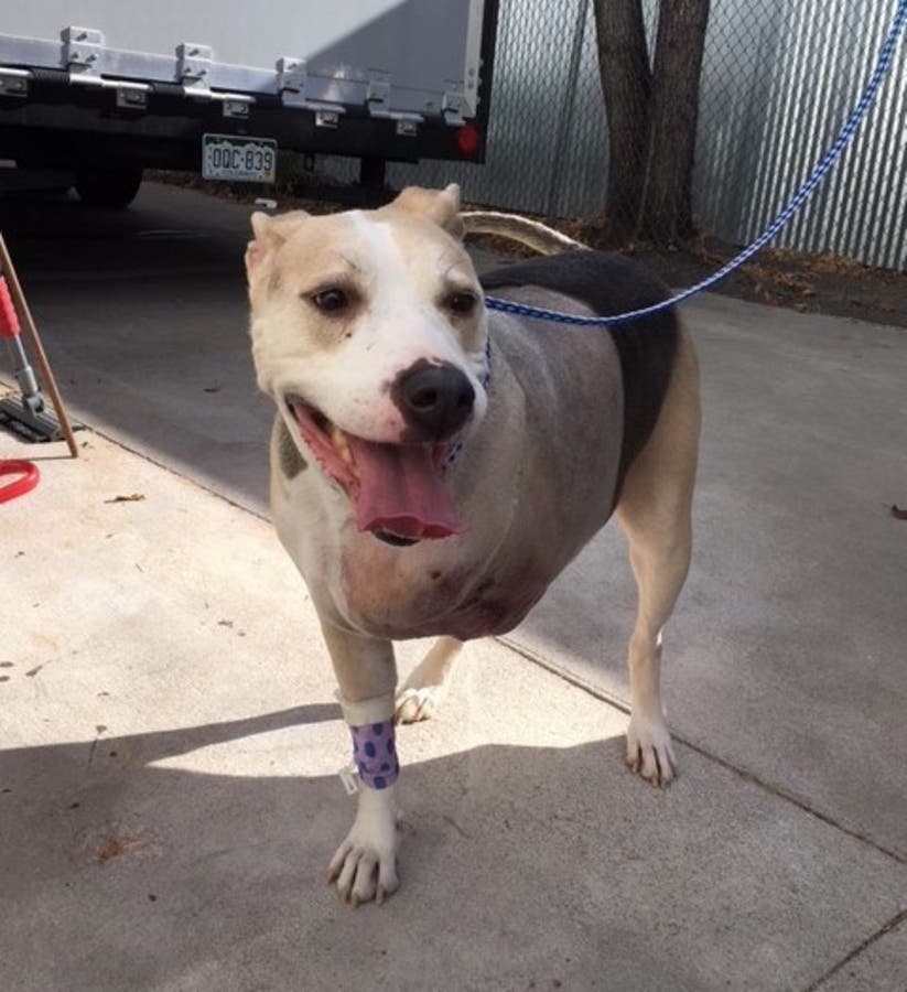 Nalla's femur was broken in three places, according to Rodrock. Rodrock said she lived on disability and could not afford to pay vet bills. She said the "local Humane Service" threatened to take away the dog. "But with your help Nalla can stay with me and I love her so much!" she wrote.