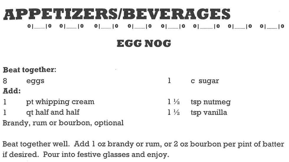 For this month’s posting, we are celebrating the holidays with an eggnog recipe from our 50th anniversary cookbook, Gallopin’ Geese & Steamin’ Engines, 2009.