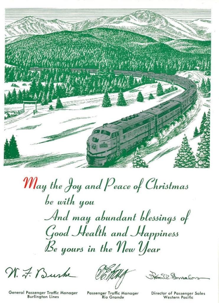 Figure 1 Burlington Christmas greeting from dining car, circa 1967. Colorado Railroad Museum collection.