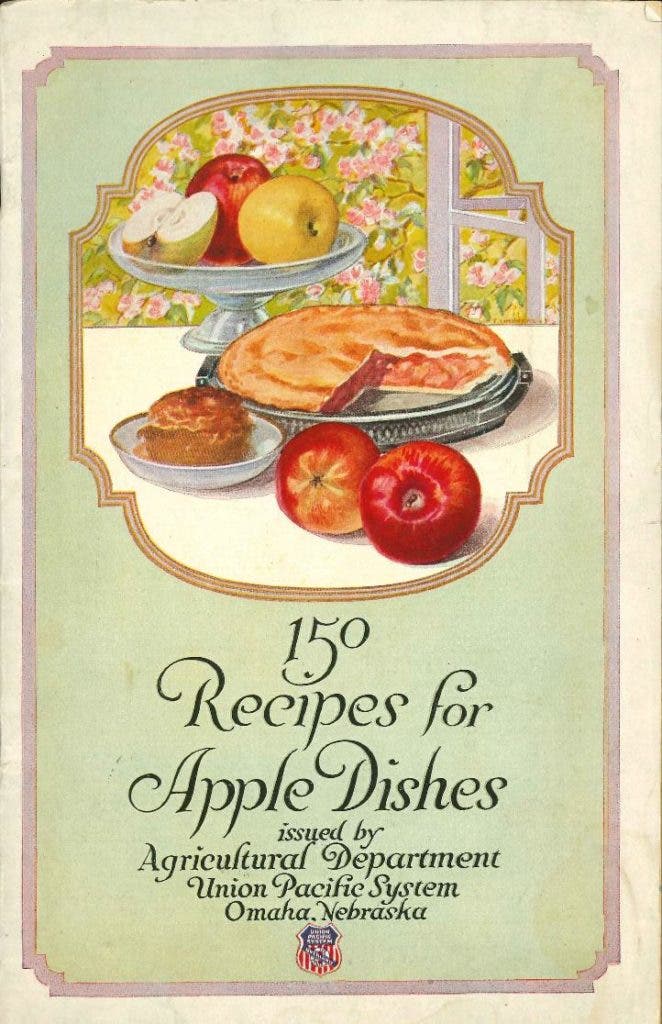 Like many other foods, apples have been and are still transported by train to markets across the country. One of the rail companies that transports apples is the Union Pacific. As a benefit to its passengers, in the 1920s the Union Pacific Agricultural Department issued a wonderful little booklet about the many uses of apples in recipes, as well as their nutritional benefits.