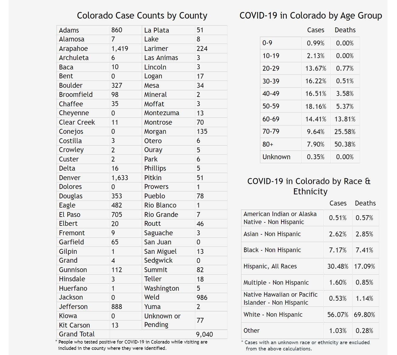 According to government data posted Friday afternoon, 9,047 people were infected with the new coronavirus in Colorado among 43,307 people who have been tested since the outbreak began. There were 1,693 people hospitalized, and 391 deaths were confirmed.