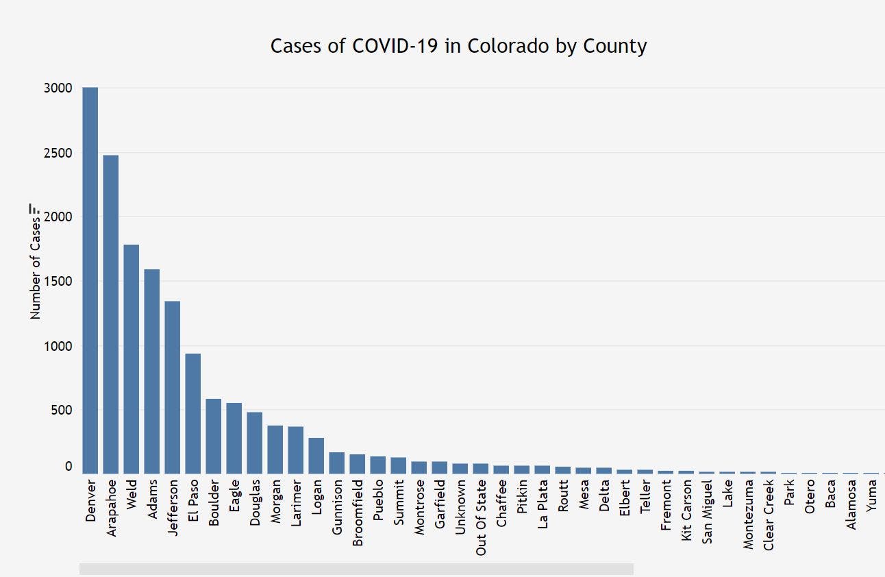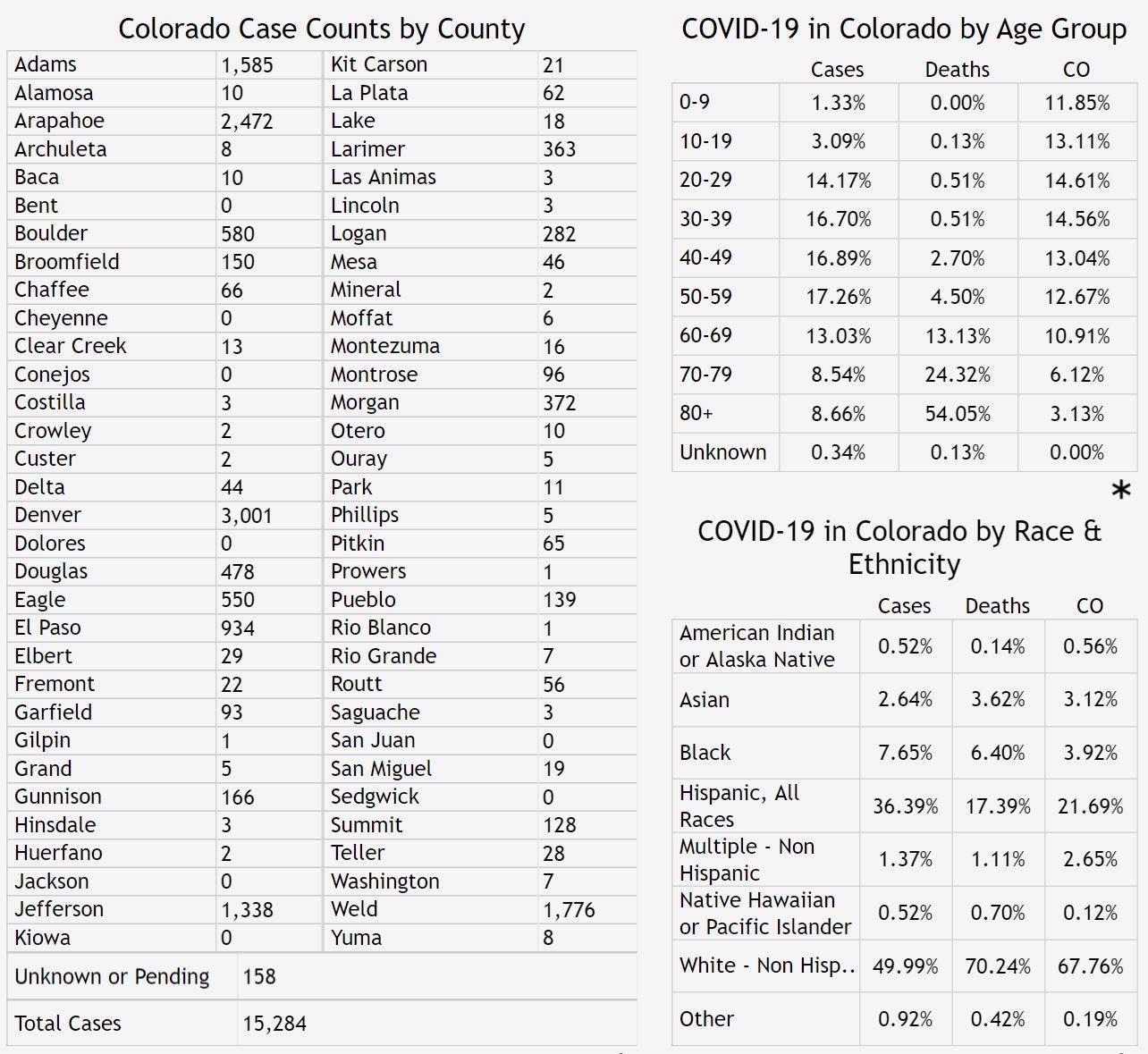 According to government data posted Thursday afternoon, 15,284 people have been infected with the new coronavirus in Colorado among 72,390 people who have been tested since the outbreak began. Around 2,697 people have been hospitalized, and the death toll has reached 777.