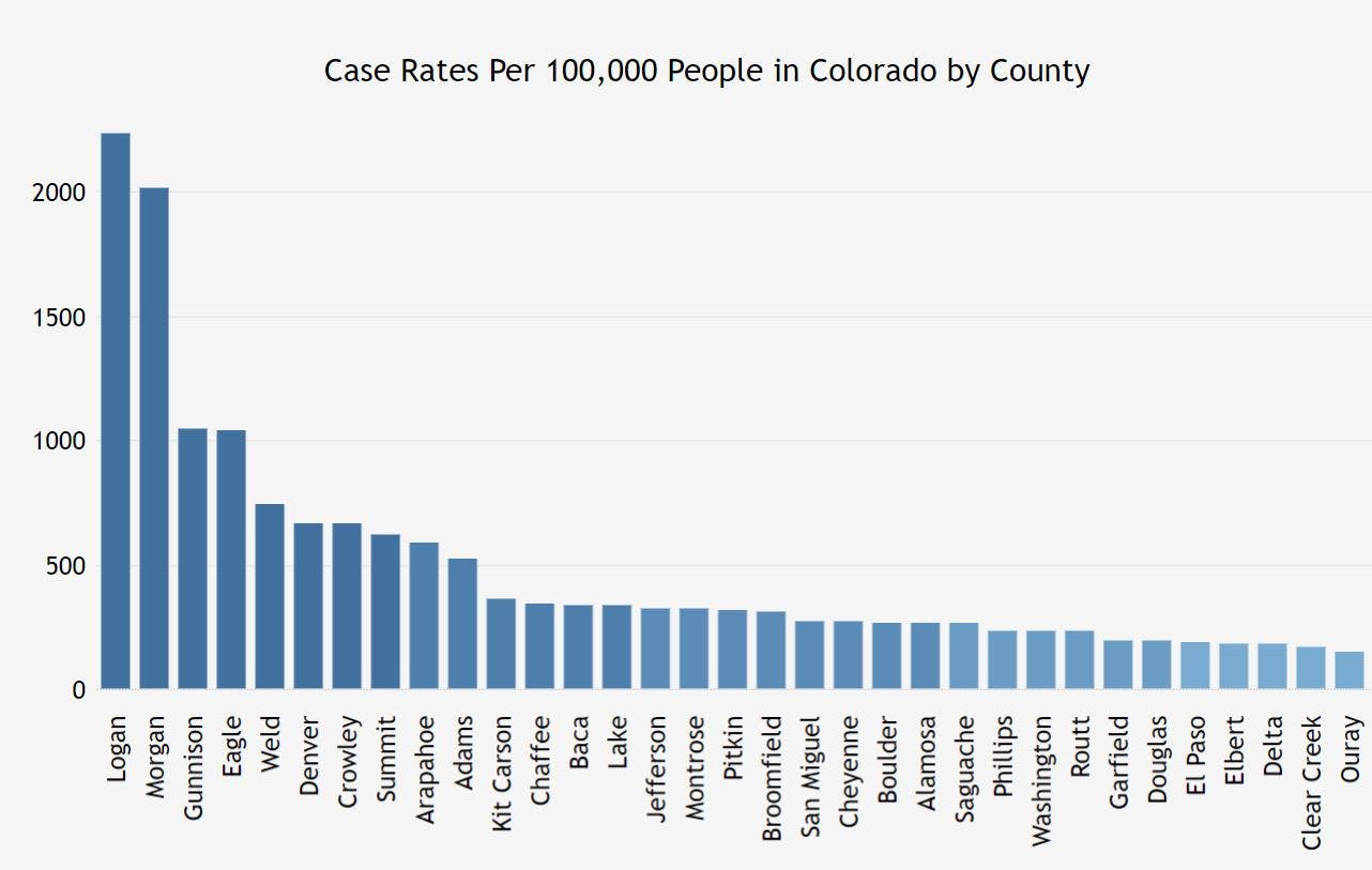Denver, Arapahoe and Weld counties consistently have the highest overall number of cases in the state; however, Morgan, Logan, Gunnison and Eagle counties consistently have the highest case rates per 100,000 people.