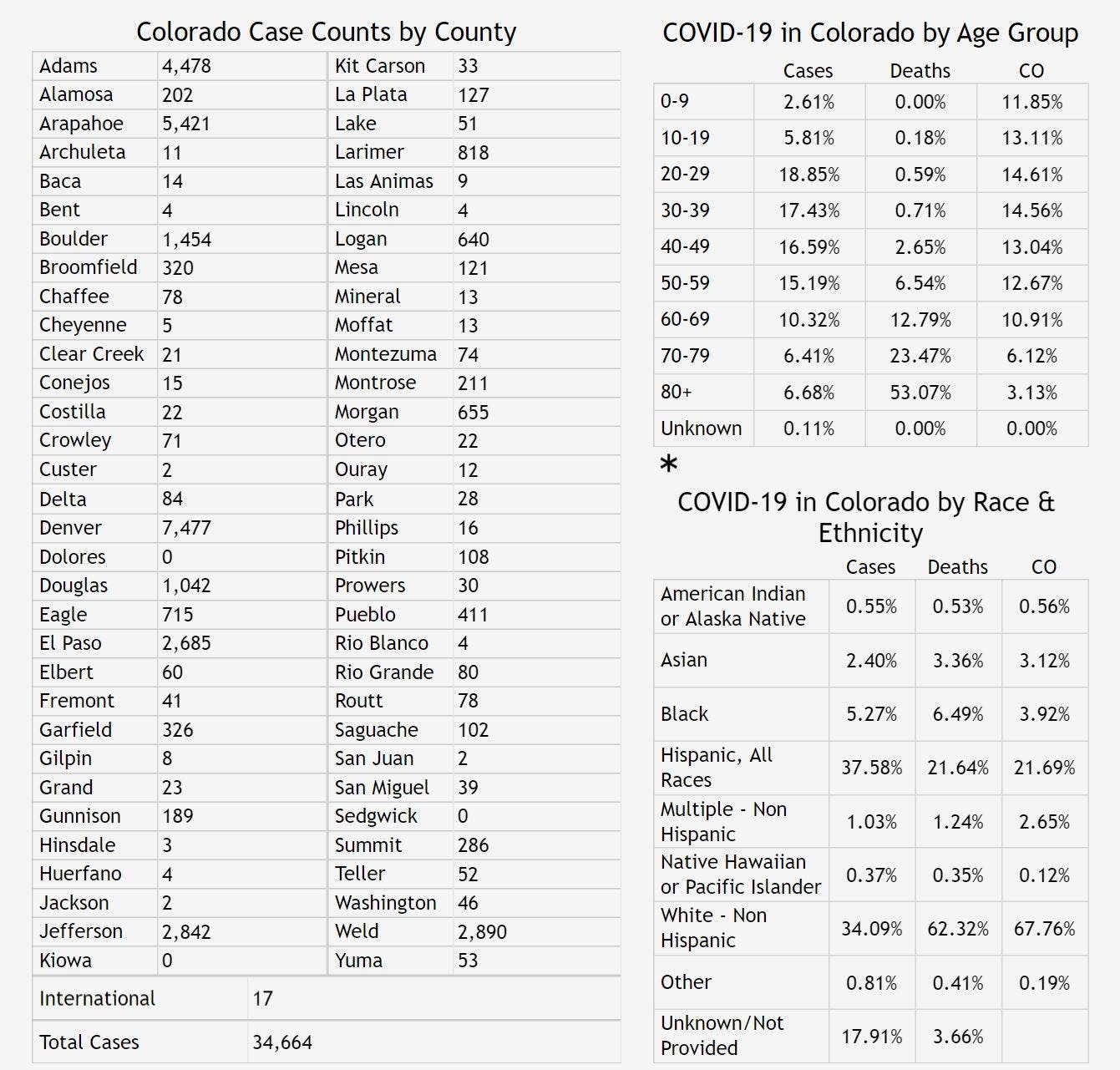 Over the past week, 1,153 new cases of the coronavirus have been reported in Colorado, according to public health data. As of Tuesday, 34,664 people had been infected with the coronavirus in the state among 362,145 people who have been tested since the outbreak began, health officials confirmed. Around 5,741 people have been hospitalized, and the death toll among people who tested positive for COVID-19 has reached 1,696.