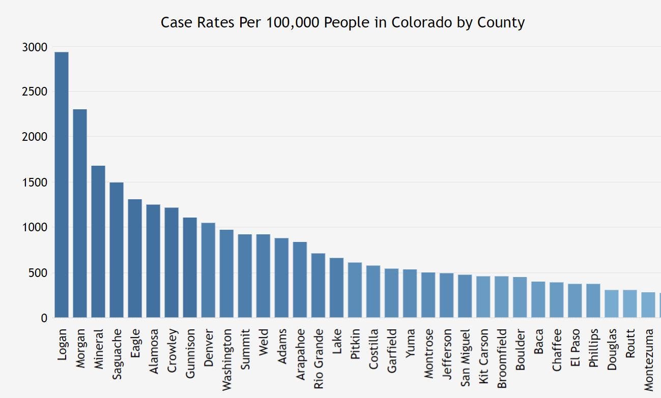 Denver, Arapahoe and Weld counties consistently have the highest overall number of cases in the state; however Weld, Summit and Adams counties have had the highest case rates per 100,000 people.