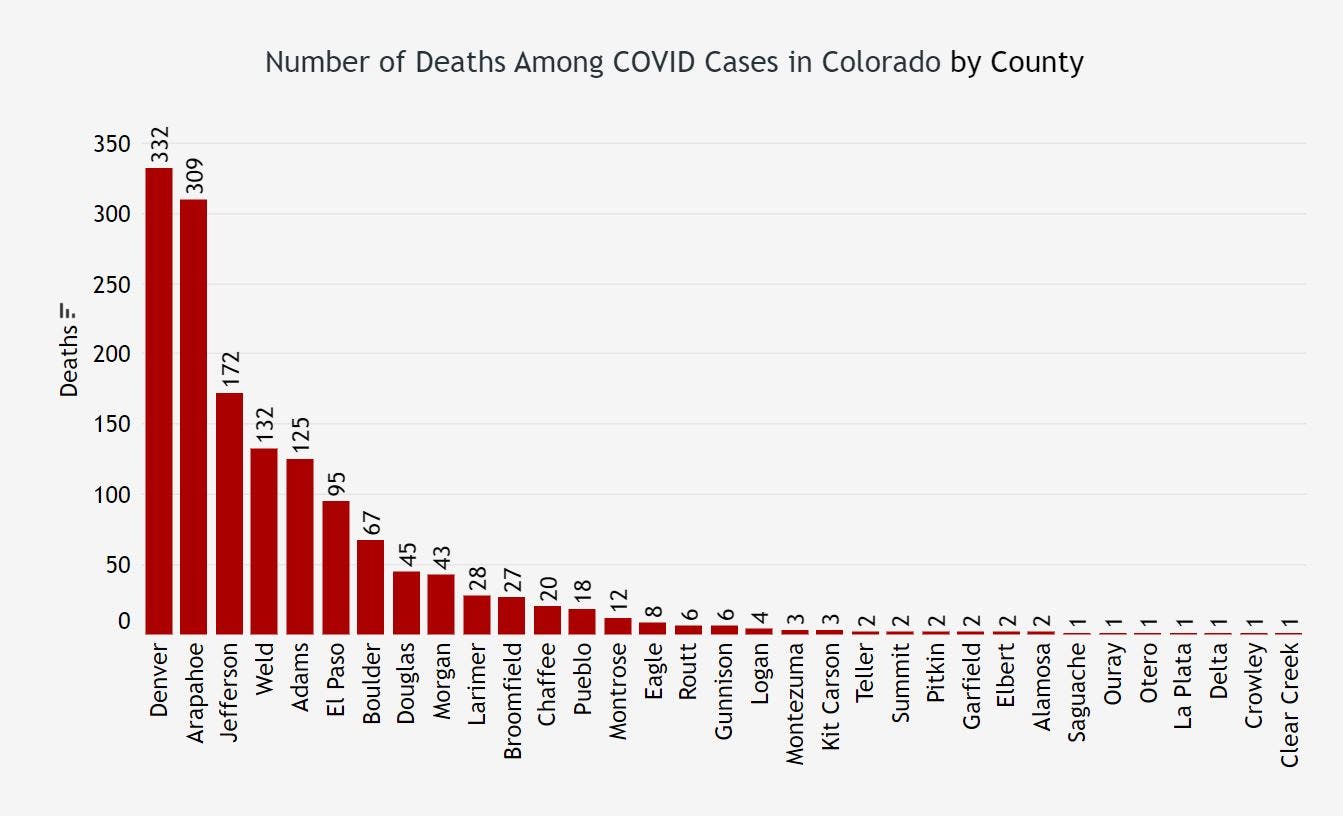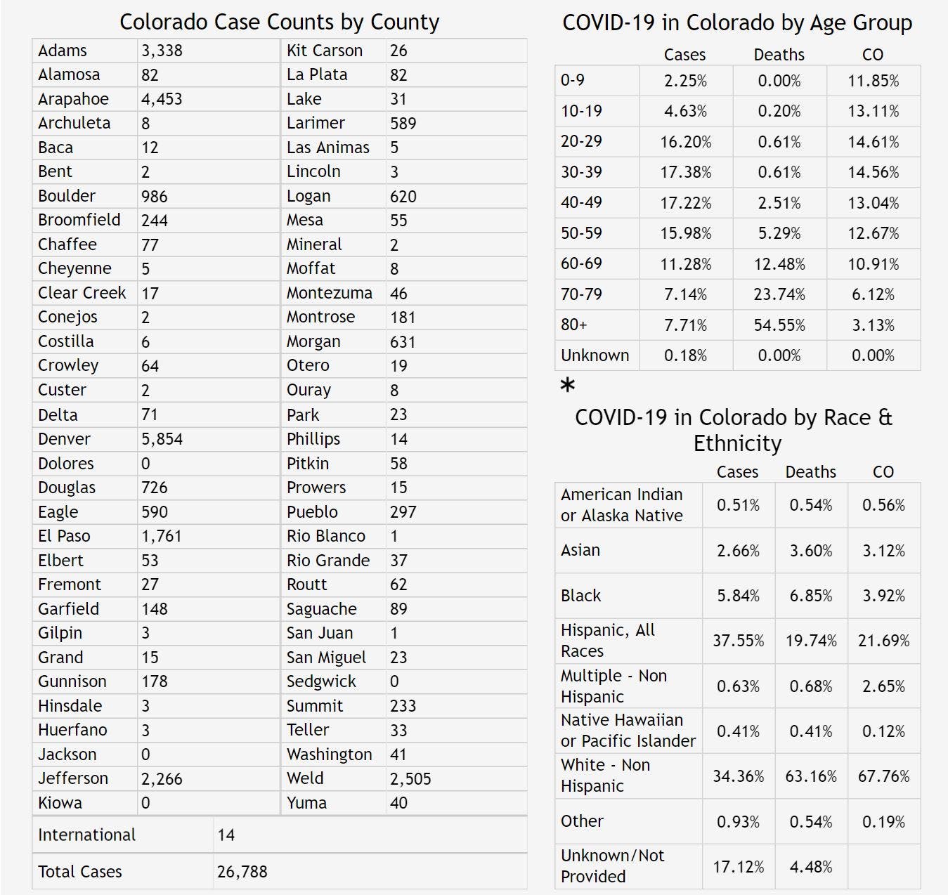 As of Tuesday afternoon, 26,788 people have been infected with the new coronavirus in Colorado among 190,700 people who have been tested since the outbreak began, health officials confirmed. Around 4,419 people have been hospitalized, and the death toll among people who tested positive for COVID-19 has reached 1,474.