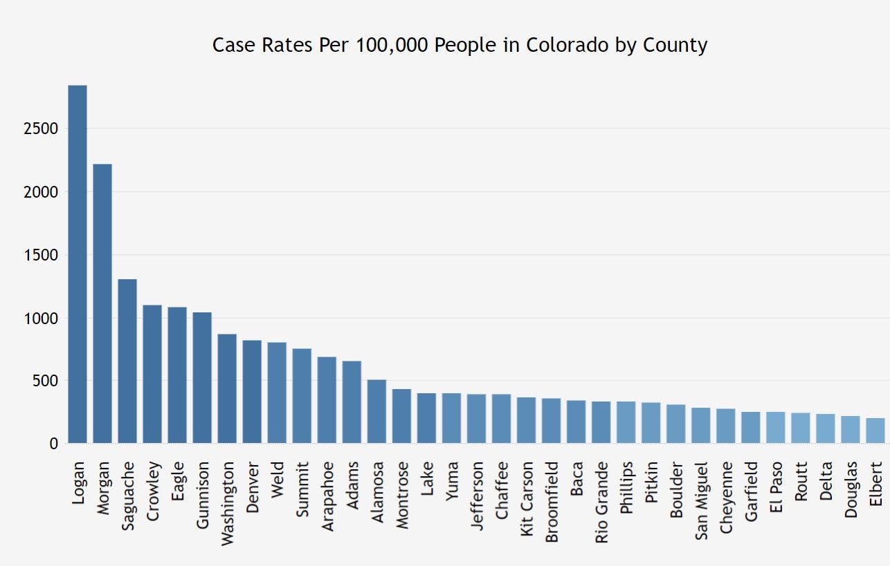 Denver, Arapahoe and Weld counties consistently have the highest overall number of cases in the state; however, Morgan, Logan and Crowley counties consistently have the highest case rates per 100,000 people.