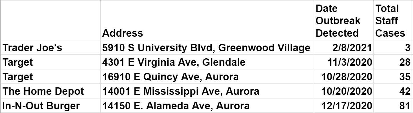 Here's a list of the latest COVID-19 outbreaks reported at stores and chain restaurants in Arapahoe County.