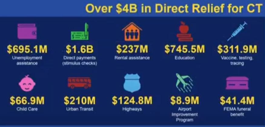 During a news conference Monday, Gov. Ned Lamont broke down the relief package into funds business and residents would automatically receive, and those for which at an application would be necessary.